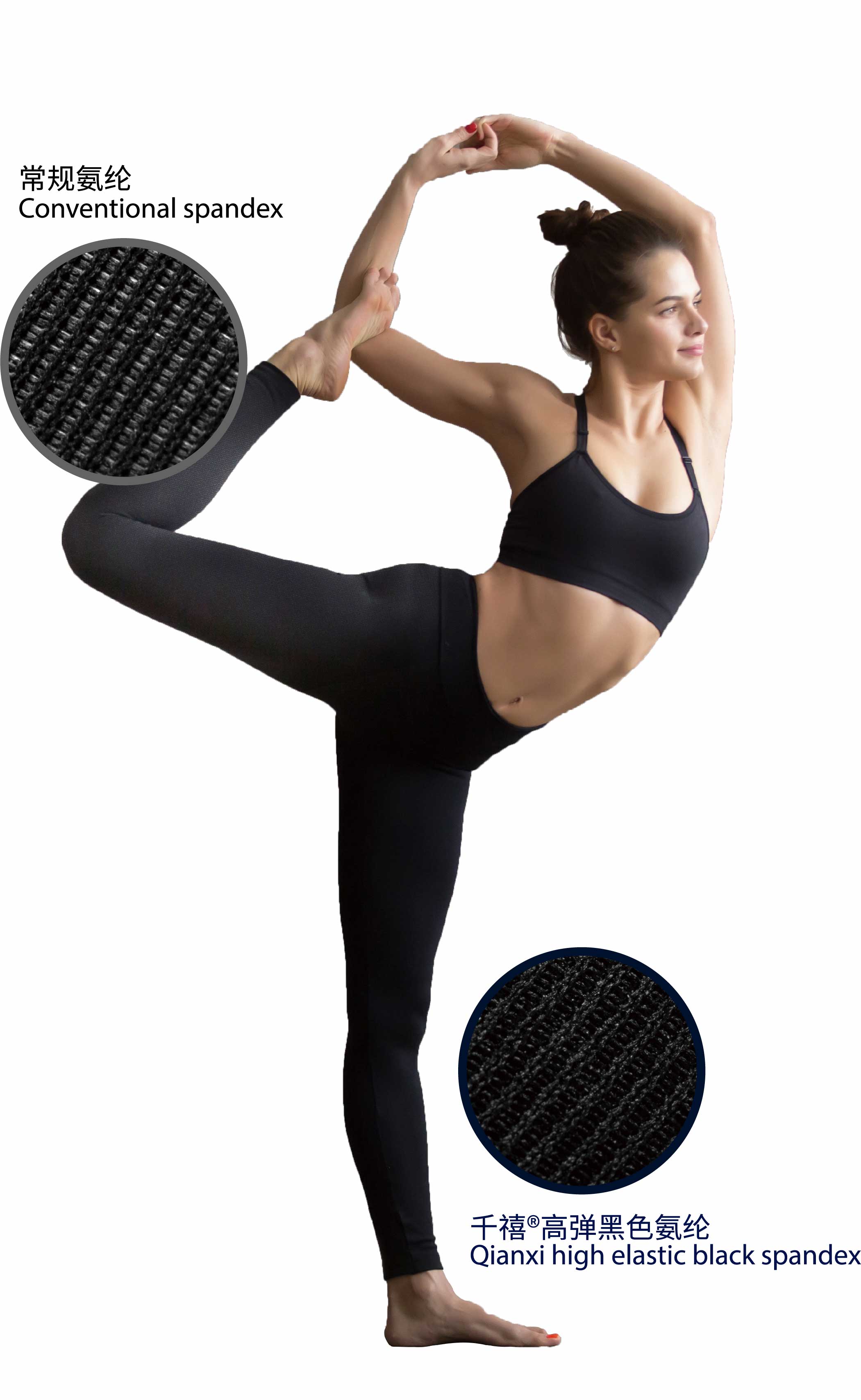 將黑色元素均勻地分散在纖維中,使紡織面料呈現(xiàn)出持久的色牢度,解決傳統(tǒng)氨綸在深色面料中因?yàn)椴簧仙斐傻穆栋讍?wèn)題,同時(shí)減少染色帶來(lái)的環(huán)境污染,滿足包紗、緯編和經(jīng)編等織造工藝需求。