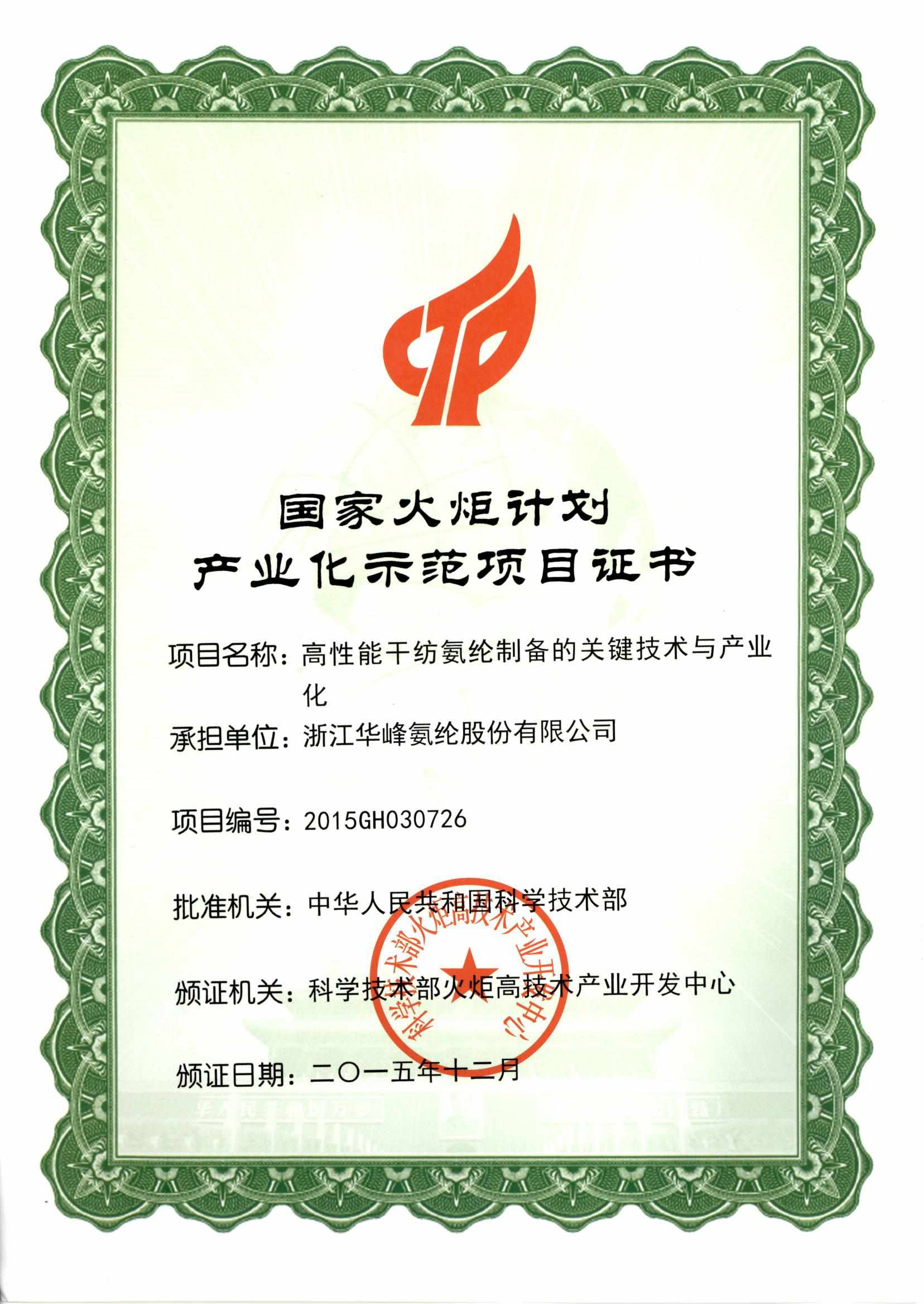 • 國(guó)家火炬計(jì)劃產(chǎn)業(yè)化示范項(xiàng)目證書