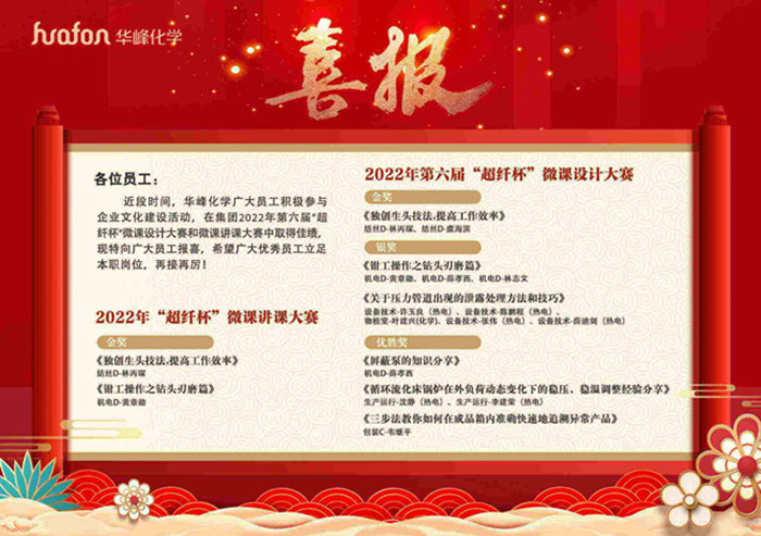 經(jīng)過一個(gè)下午緊張激烈的比拼,來自化學(xué)公司的林丙琛、黃章勛和聚酰胺事業(yè)部的盧劍等3位選手獲得本屆微課講課比賽金獎(jiǎng),集團(tuán)公司的黃雪芹等5位選手獲得銀獎(jiǎng)。