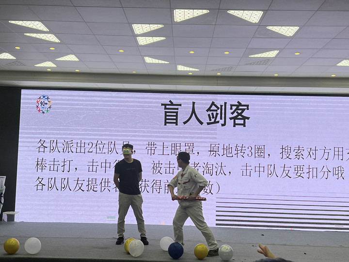 在盲人劍客環(huán)節(jié),90+聯(lián)盟成員李輝和孫程鵬在隊(duì)員的指揮下,為大家?guī)砹伺醺勾笮Φ谋硌荩趯O程鵬的奮力一擊下,李輝突然來了個(gè)假動(dòng)作,反手追擊一劍,最終擊敗對(duì)手,A隊(duì)獲得最終勝利。