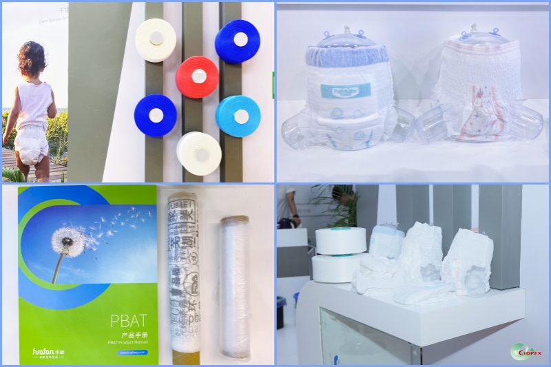 本次展會(huì),華峰化學(xué)攜旗下千禧衛(wèi)材用氨綸產(chǎn)品精彩亮相。作為一種可替代傳統(tǒng)橡膠制松緊線的彈性材料,千禧?衛(wèi)材用氨綸產(chǎn)品彈性和退繞性能優(yōu)異,達(dá)到國(guó)際前列水平,可以廣泛應(yīng)用在紙尿褲、拉拉褲、經(jīng)期褲、紙尿片等衛(wèi)生用品中。同時(shí),產(chǎn)品規(guī)格和性能可滿足定制化需求,采用大絲卷包裝。此外,來(lái)自環(huán)保公司的PBAT和PPC下游應(yīng)用產(chǎn)品也一同在展位上展出。