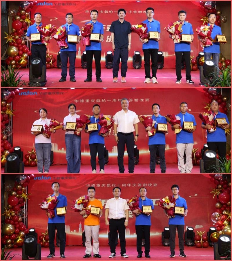 “他們是公司發(fā)展道路上的見證者和奮斗者。他們無私奉獻、團結協(xié)作,在過去的十年中,他們秉持著對工作的熱愛和責任感,為公司的穩(wěn)定發(fā)展做出了突出貢獻……”晚宴期間,華峰重慶氨綸公司還特別表彰了16位榮耀員工,與會領導向他們頒發(fā)了榮譽獎杯,并向他們表達了最真摯的感謝和敬意。
