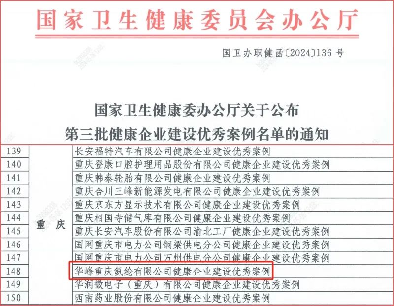 日前,國家衛(wèi)生健康委辦公廳公布第三批健康企業(yè)建設優(yōu)秀案例名單,華峰重慶氨綸有限公司成功入選,是重慶市本次獲評12家企業(yè)之一,也是涪陵區(qū)歷年以來唯一上榜的企業(yè)。