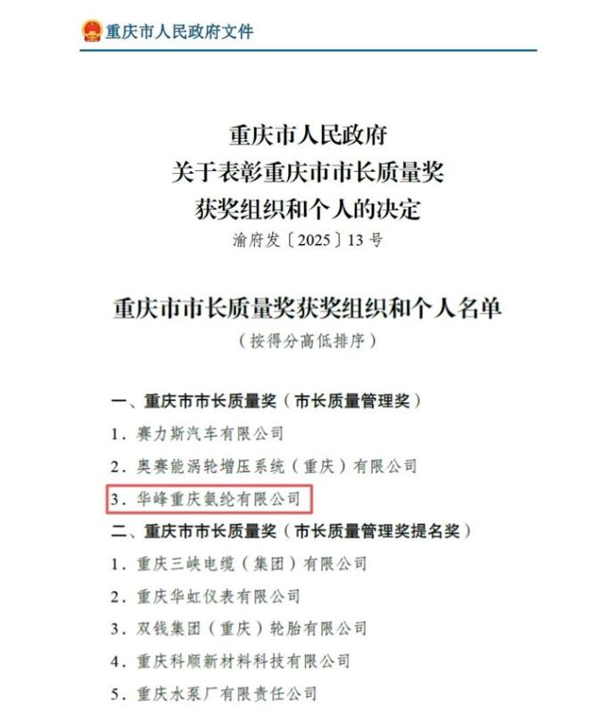 近日,2025年重慶市市長(zhǎng)質(zhì)量獎(jiǎng)獲獎(jiǎng)名單公布,華峰重慶氨綸有限公司憑借在質(zhì)量管理模式建設(shè)、創(chuàng)新實(shí)踐及社會(huì)價(jià)值創(chuàng)造等方面的突出表現(xiàn),榮獲重慶市市長(zhǎng)質(zhì)量管理獎(jiǎng),成為重慶市涪陵區(qū)首家獲此殊榮的企業(yè)。