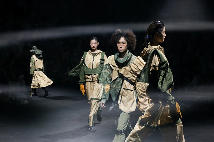 首批入庫品牌發(fā)布之后,一場定位于“未來運動美學全景演繹”的泛運動超級大秀精彩上演。這場大秀匯聚了在首屆“千禧”杯服裝設計大賽中涌現(xiàn)出的60套優(yōu)秀設計作品。中國青年設計力量以多元化的運動項目為載體,融合攀巖、滑雪、徒步、露營、潛水、劍術等多種戶外體驗,通過前沿材料的創(chuàng)新應用,探索運動時尚的全新邊界,展示纖維材料在功能性、舒適性和創(chuàng)意表達上的無限可能。大秀從科技感和極限運動為主調(diào)的戶外探險拉開序幕,到動感與時尚的城市運動系列,再到輕松舒適的山野漫步系列,最后以充滿童趣的溫馨畫面結尾,也象征著未來的希望。